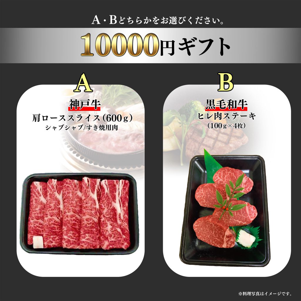 A:神戸牛 肩ローススライス(600g) しゃぶしゃぶ/すき焼き肉 B:黒毛和牛 ヒレ肉ステーキ(100g×4枚) ※A、Bの2種のうち1種を選択してください